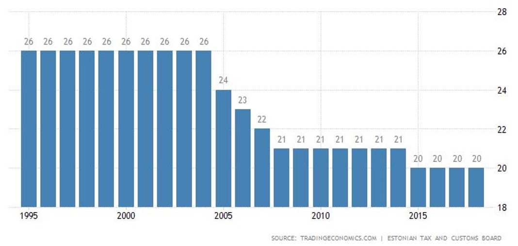 Zgodno je napomenuti da je Estonija prvobitno uvela svoj sada poznati cash flow sustav oporezivanja dobiti sa stopom od 26%, odnosno istom stopom kojom se na klasični način oporezivala dobit. Od tada se porezna stopa poreza na isplaćenu dobit smanjila pet puta, te danas iznosi 20% (Slika 1).