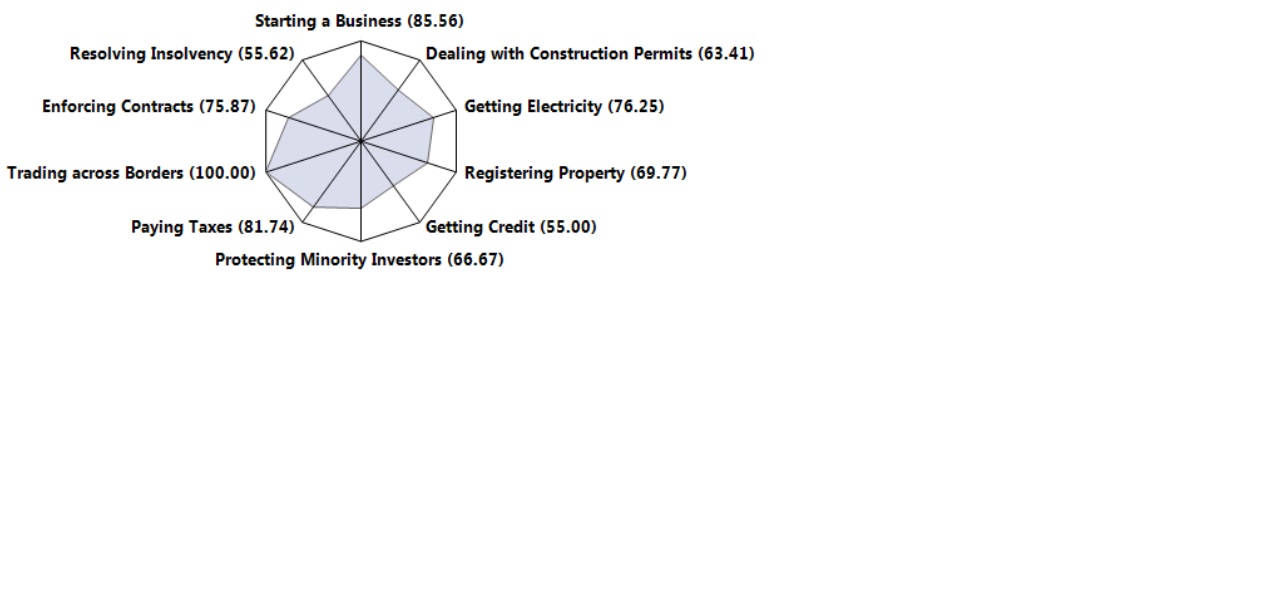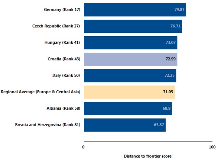 Usporedba Hrvatske sa susjednim zemljama, prosjekom regije te s Njemačkom pokazuje kako se Hrvatska prema DTF-u nalazi u društvu Italije i Mađarske te iznad regionalnog prosjeka (Slika 2). Iz navedenog se može zaključiti da lakoća poslovanja u Hrvatskoj nije na toliko niskoj razini. Ipak, postoji mnogo prostora za napredak. Doing Business 2017 može biti dobar poticaj prema naprijed.