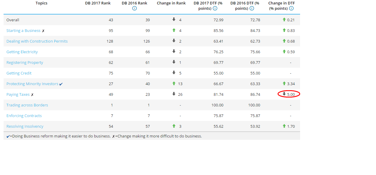 Iako prema DTF-u u području Plaćanja poreza Hrvatska ne stoji značajno loše, ova je godina specifična budući da je u njemu zabilježen i najveći pad DTF-a, a time i ukupnog ranga. Razlog za taj negativan pomak je obveza plaćanja HRT pretplate i odustajanje Hrvatske gospodarske komore od smanjenja obvezne članarine koje je država čak dogovorila.
