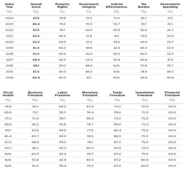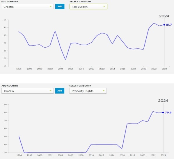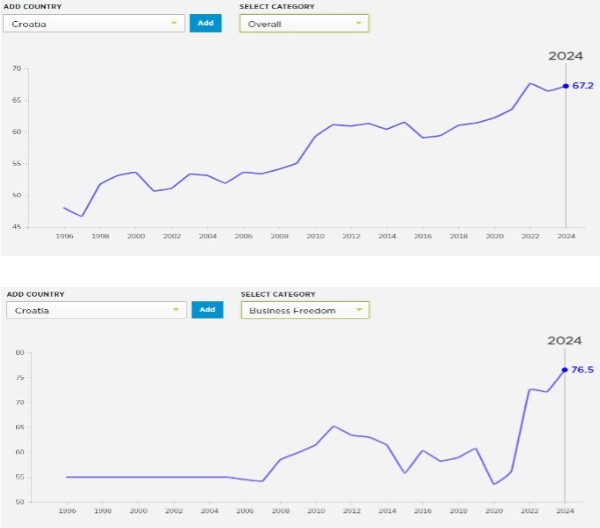 Slijedom toga, prema podacima za izvještajno razdoblje 2014.-2024., Hrvatska je ostvarila rast ekonomske slobode povećavši broj bodova u sljedećim kategorijama javnih politika: ekonomske slobode (6,8; ukupna razina, s time da je isti broj bodova imala i u izvješću od prije dvije godine); vlasnička prava (39,8); radna sloboda (28,8); poslovna sloboda (15,1) i porezno opterećenje (12,3).