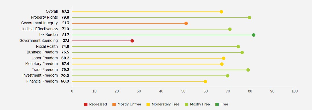 S druge strane, u okviru istog izvještajnog razdoblja, u sljedećim područjima zabilježen je pad broja bodova: državna potrošnja (18,7), monetarna sloboda (11,8), investicijska sloboda (10,0) i trgovinska sloboda (8,2). Gledajući kriterije iz metodologije Heritage Foundation, navedena smanjenja odnose se na: rast udjela trogodišnje potrošnje opće države u BDP-u na zabilježenih 49,3 % (premda trenutni podaci možda govore o nešto manjem udjelu); rast trogodišnje stope inflacije (dok recentniji podaci bilježe konačni pad stope, što bi trebalo biti zabilježeno u narednom izvješću), kontrole cijena i subvencije (mjere vezane uz razdoblje covid pandemije i inflacije); (ne)carinske trgovinske zahtjeve prema trećim zemljama (što je nadležnost trgovinske politike EU-a) te državne potpore.