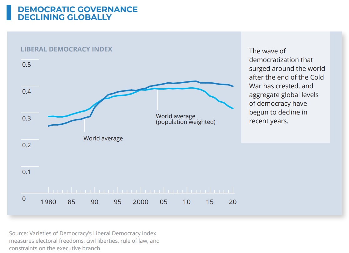 Izvješće američke Obavještajne zajednice Globalni trendovi 2040 iznijelo je među mnogim geopolitičkim rizicima i onaj vezan uz eroziju demokracije u svijetu (kada se gleda broj demokratskih zemalja u odnosu na ukupno svjetsko stanovništvo). Pritom su među unutarnjim faktorima nepovjerenje javnosti u elite (primjerice zbog imigracije), što je dovelo do rasta neliberalnih lidera koji potkopavaju demokratske norme, institucije i građanske slobode. U novim demokracijama, koje su bile u tranziciji iz autoritarnih režima, javljaju se demokratska stagnacija, slabljenje institucionalnih kapaciteta države i vladavine prava, korupcija i krhka tolerancija prema opoziciji. Kao vanjski akteri, Kina i Rusija potkopavaju demokracije i podržavaju neliberalne režime. Kako unutarnji tako i vanjski akteri u povećanom se obujmu koriste širenjem dezinformacija i manipulacijama digitalnih informacija. Dok se među više mogućih scenarija ističe konkurentska koegzistencija (Competitive Coexistence) SAD-a i Kine kao glavnih geopolitičkih rivala, moguća je renesansa demokracija (Renaissance of Democracies) pod vodstvom SAD-a i saveznika iz Europske unije, UK i savezničkih zemalja.