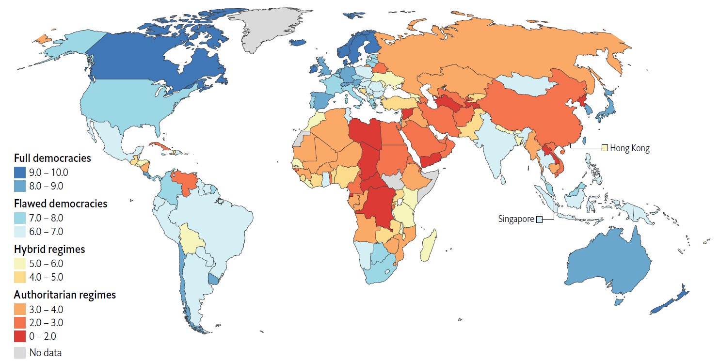 Podaci za 167 zemalja od Economist Intelligence Unit jasno govore kako manje od desetine svjetskog stanovništva živi u punim demokracijama, a polovica živi pod nedemokratskim i autoritarnim režimima.