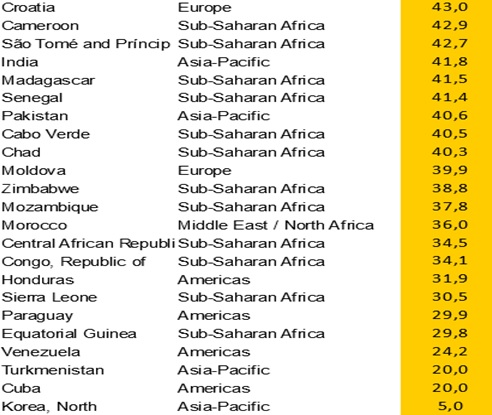 Na slici 2. se vidi padajući popisa država po stupnju radne slobode te možemo izlučiti informaciju da je Hrvatska druga najlošija država po pitanju radne slobode u Europi, iza izolirane i politički nestabilne Moldavije. Ujedno je važna činjenica da je Hrvatska po radnoj slobodi bliža Venezueli nego Austriji. Apsolutno gledano, Hrvatsku dijeli 18,8 bodova od Venezuele, te 23,7 od Austrije.