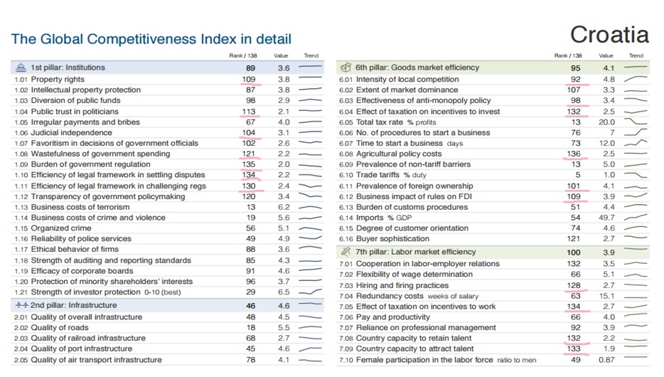Hrvatska je 74. po konkurentnosti u svijetu. Tek toliko da je bolja od susjednih zemalja bivše Jugoslavije. Rezultati Svjetskog izvješća o konkurentnosti 2016-2017 samo potvrđuju dosadašnje hrvatske rezultate. Određene reformske javne politike su se konačno počele sustavno provoditi. Ipak, potrebno je znati 2 činjenice: 1. Rezultati reformi se kroz ovakvo izvješće mogu vidjeti tek srednjoročno. 2. Čak i ako se postigne određeni napredak, to može značiti veći skor, ali ne nužno i ranking. Ako su druge zemlje napredovale još više, logika konkurentnosti je onda sasvim jasna. Dakle, povećanje konkurentnosti zahtijeva daleko veću razinu ambicija od želje da se napravi nekakav napredak (u odnosu na ono gdje smo prije bili). U pitanju je spremnost da velikim ambicijama želimo preskakati druge.