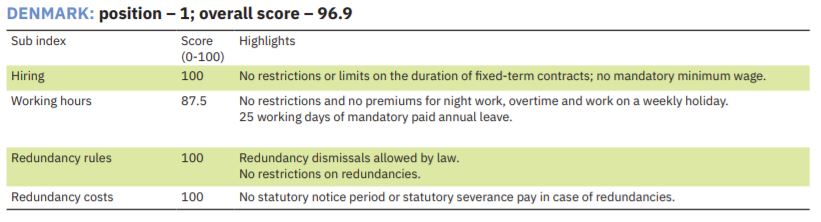 Na temelju spomenutih izvora dobiveni su sljedeći rezultati. Danska se nalazi na vrhu liste sa 96.9 bodova, od mogućih 100. Danski model fleksigurnosti je općenito poznat kao jedan od najuspješnijih na svijetu te se u više navrata kod nas razmatralo približavanje tom konceptu. Iza nje slijedi SAD koji je poznat po fleksibilnom tržištu rada, odnosno Japan, UK, Kanada i Irska.