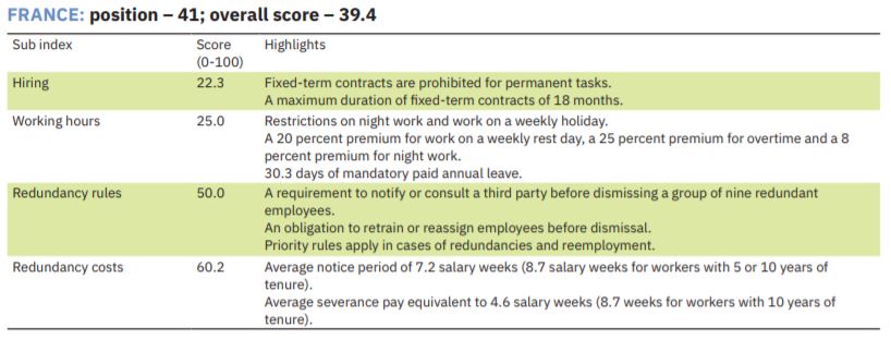 Na dnu liste je, isto očekivano Francuska sa 39.4 boda od mogućih 100. Francuska je poznata po rigidnosti radnog zakonodavstva. Ipak, predsjednik Macron je već počeo provoditi reformu tržišta rada.