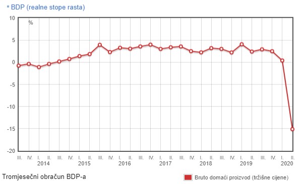 Državni zavod za statistiku (DZS) danas je objavio procjenu kretanja bruto domaćeg proizvoda (BDP-a) za II kvartal 2020. Procjena ukazuje da je tromjesečni BDP u II kvartalu pao za 15,1% u odnosu na I. kvartal iz 2019., a za 14,9% u odnosu na I. kvartal 2020.