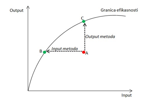 Metoda omeđivanja podataka (DEA), pojednostavljeno (za detalje pogledati ovdje), određuje granicu efikasnosti i, na temelju odnosa inputa i outputa, pozicionira zemlje na granicu ili ispod nje te za njih određuje vrijednost parametara efikasnosti. Zemlje koje su na granici imaju vrijednost parametra 1, a one ispod između 0 i 1. DEA se može temeljiti na input metodi ili output metodi, a njihova razlika je prikazana na Slici 3.