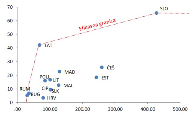 Dijagram rasipanja omogućuje da se stvarni podatci „omeđe“ spajanjem krajnjih točaka kako bi se dobila granica efikasnosti. Tri zemlje određuju granicu efikasnosti u ovom uzorku – Rumunjska, Latvija i Slovenija. Sam pogled na sliku pokazuje da Rumunjska i Latvija imaju niža ulaganja od Hrvatske, ali su one uz zadanu razinu inputa efikasnije od Hrvatske. Slovenija pak ima značajno veća ulaganja, i to efikasna.
