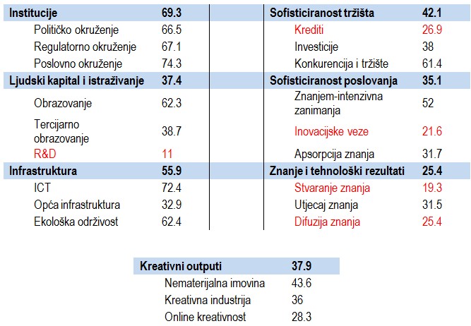 U Tablici 1 su prikazani rezultati (od 0-100) za svaki od stupova i njihovih temeljnih pod-kategorija (svaka od njih se još dijeli, ali za detalje pogledati ovdje). Crvenom bojom je označeno pet najproblematičnijih područja koja ukupan rezultat za Hrvatsku drže na tako niskoj razini (39.8/100), a to su R&D, stvaranje znanja, inovacijske veze, difuzija znanja i krediti (dostupnost financiranja).
