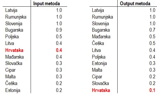 Kako bi se shvatila razlika u ovim metodama treba se podsjetiti da input metoda Hrvatsku „vuče“ prema lijevo, prema Rumunjskoj, kroz smanjenje inputa uz zadani output, dok output metoda „gura“ Hrvatsku gore, kroz povećanje outputa uz zadani input, prema Latviji.