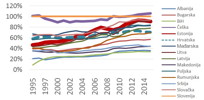 Slika 1. BDP po stanovniku prema paritetu kupovne moći u tekućim USD, u odnosu na Sloveniju, 1995.-2015.
